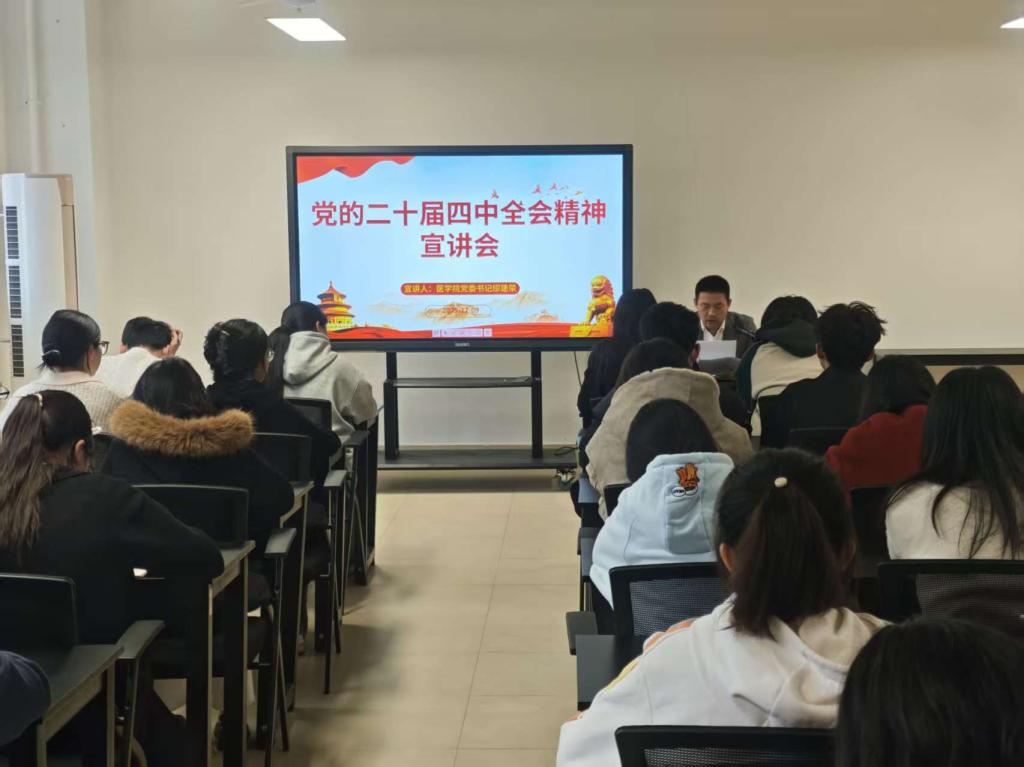 为推动党的二十届四中全会精神落地生根,12月9日,医学院党委书记缪建荣在学生社区第三园区党团活动室作专题宣讲。教师第一党支部党员代表、学生第二党支部全体师生党员及院学生会干部参会。
