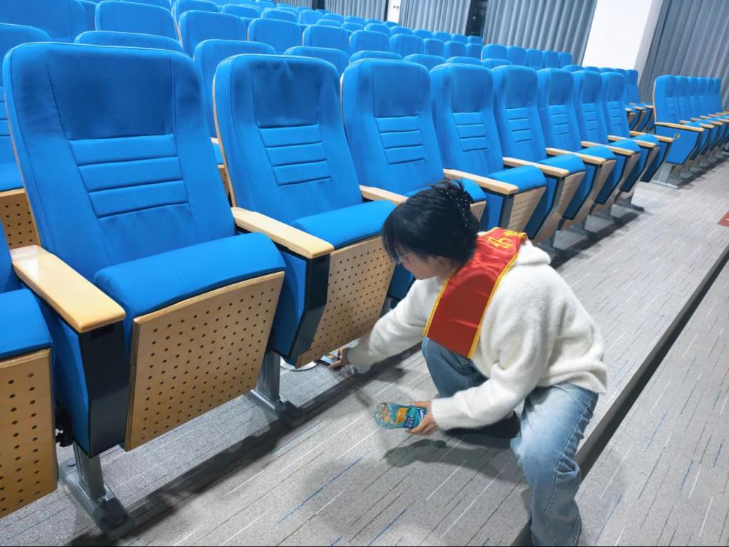 活动中,志愿者们对医教2楼、4楼报告厅及走廊区域进行清洁,大家分工明确、协作有序,对报告厅内的座椅缝隙、地面角落、讲台区域进行全方位细致清扫,同时对走廊公共区域的杂物、垃圾进行彻底清理,报告厅及周边环境更加干净整洁。