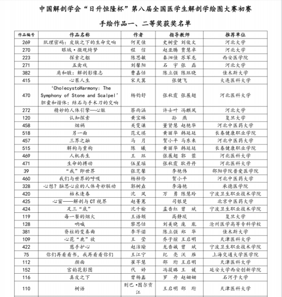 10月19日,中国解剖学会主办的“日升恒隆杯”第八届全国医学生解剖学绘图大赛在河北大学圆满落幕。医学院选送的手绘作品《本草印脏·医意流芳》(作者:王祉纯,2022级护理学专业,指导教师:霍介超)进入一、二等奖决赛,实现了学校在该项全国赛事中奖项零的突破。