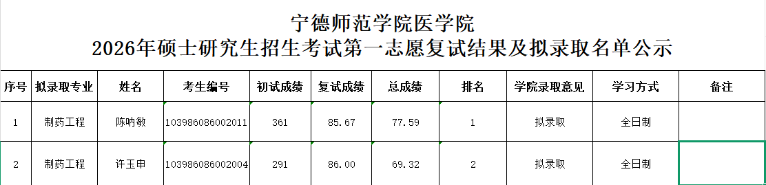 根据《宁德师范学院2026年硕士研究生招生复试录取工作办法》和我院2026年硕士研究生招生复试录取实施细则及复试情况,现将我院第一志愿复试结果和拟录取名单公示如下(附后)。如有疑义,请按如下联系方式反馈。